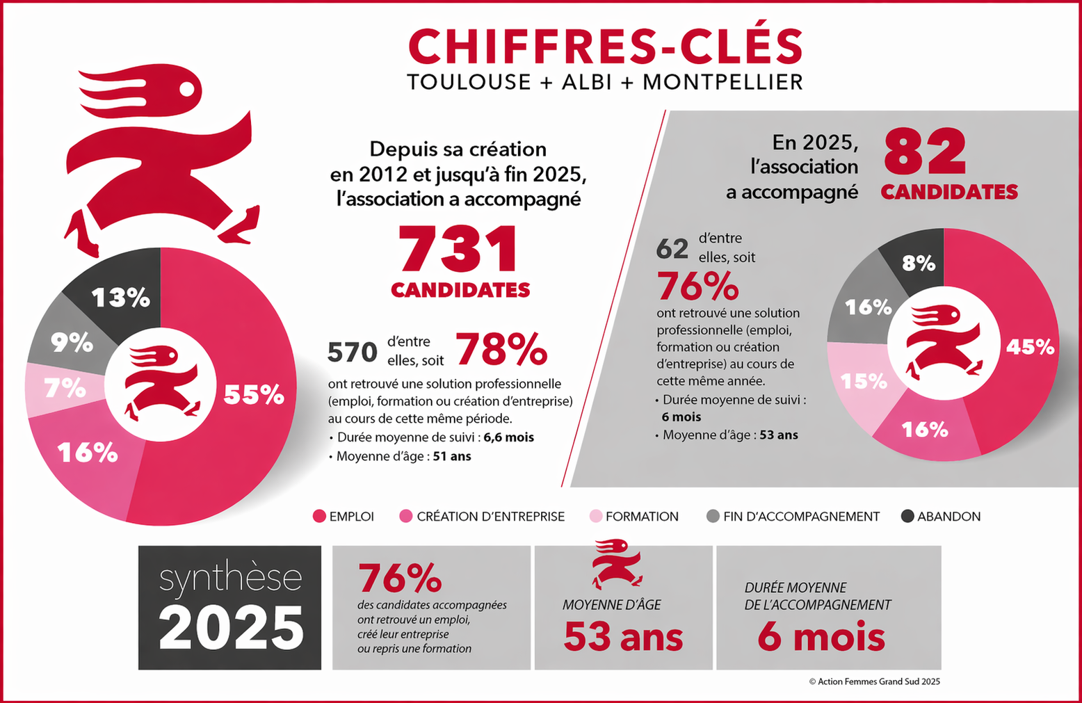 Depuis la création de l’association en 2012, ce sont désormais 731 femmes accompagnées, dont 570 ont accédé à une solution professionnelle, soit un taux de réussite global de 78 %. Notre accompagnement reste fidèle à notre ADN : personnalisé, collectif et bienveillant, avec une durée moyenne de suivi de 6 mois en 2025, pour un public dont l’âge moyen est de 53 ans cette même année.